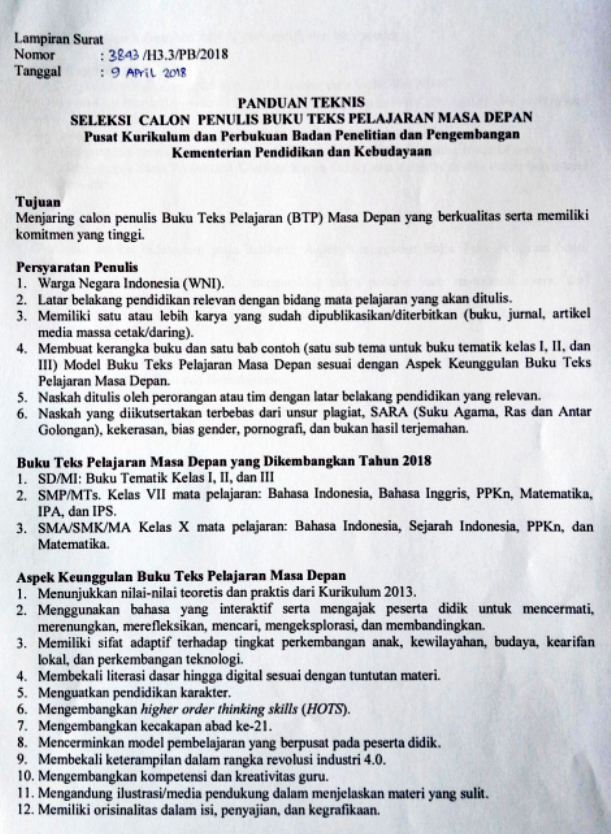 Seleksi Penulis Buku Teks Pelajaran Tingkat Nasional Tahun 2018