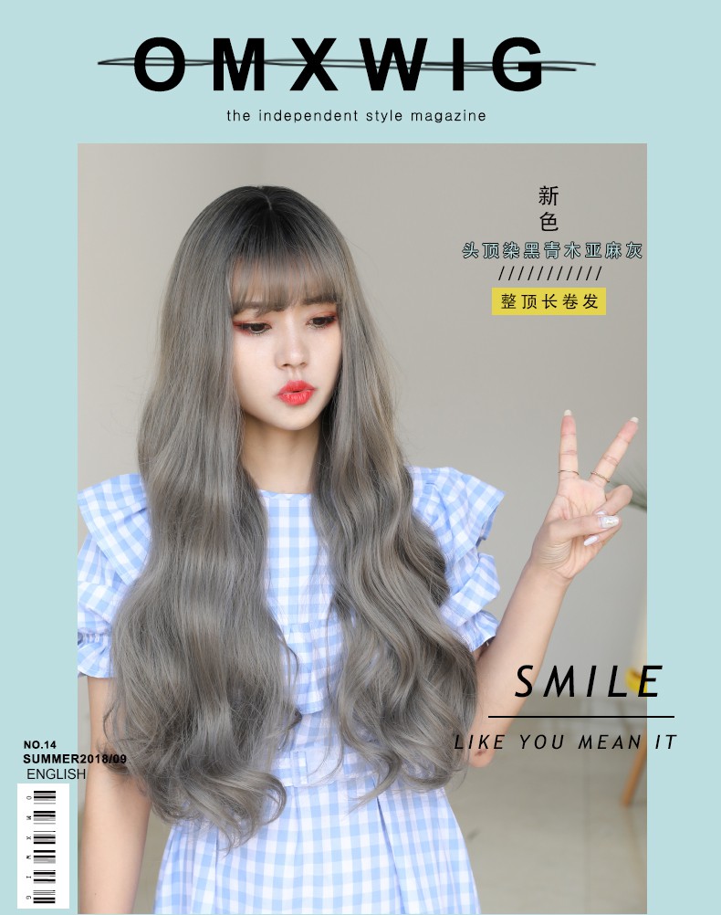 Wig Perempuan Rambut Panjang Keriting Gelombang Besar Berbulu Poni