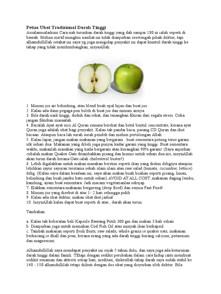 Petua ubat tradisional darah tinggi assalamualaikum cara nak turunkan darah tinggi yang dah sampai 180 ni ialah seperti di bawah. Ia juga penting untuk menyingkirkan bahan buangan dan karbon dioksida. Jenis obat ini umumya memiliki beragam bentuk seperti kapsul bubuk cair atau tanaman yang sudah dikeringkan dan dicincang. Penyakit tekanan darah tinggi membutuhkan pengelolaan kesehatan yang baik.